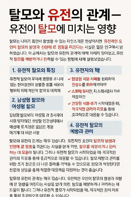 탈모와 유전의 관계는 매우 깊습니다. 유전적인 요인이 탈모의 발생과 진행에 큰 영향을 미친다는 사실을 알게 되면, 탈모를 예방하거나 관리하는 데 도움이 됩니다. 그러나 유전적 탈모가 시작되었을 때, 적극적인 관리와 치료를 통해 효과적으로 대응할 수 있습니다. 탈모 예방과 관리를 위한 조기 접근은 더 나은 결과를 가져올 수 있으므로, 탈모가 걱정된다면 전문의와 상담을 통해 적절한 대응책을 마련하는 것이 좋습니다.